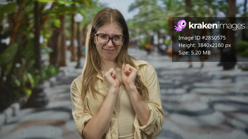 Young blonde woman wearing glasses wrinkles nose and raises hands in a sunlit green park walkway; disgust.