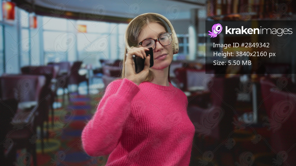 Young blonde woman wearing headphones holds smartphone to lips singing inside vibrant restaurant; joy.
