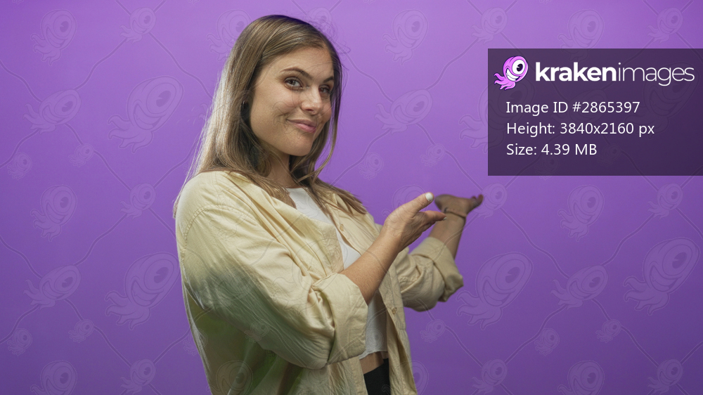 Young blonde woman wearing light beige shirt presenting palm and smiling in purple studio; confidence.