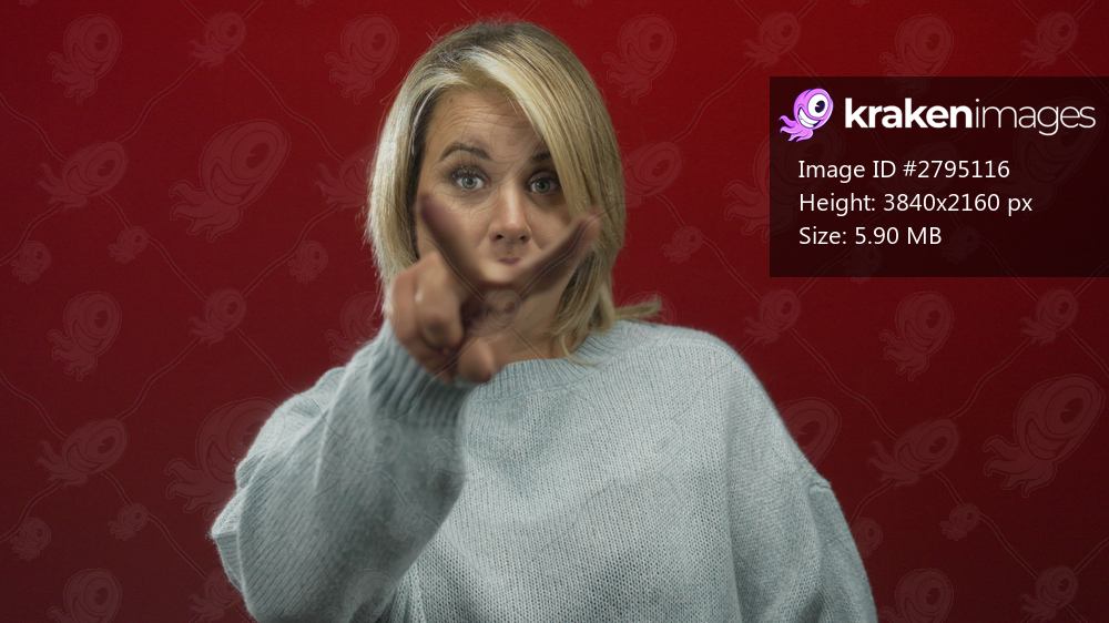 Young blonde woman wearing light gray sweater points finger to a digital camera in a red studio; command.