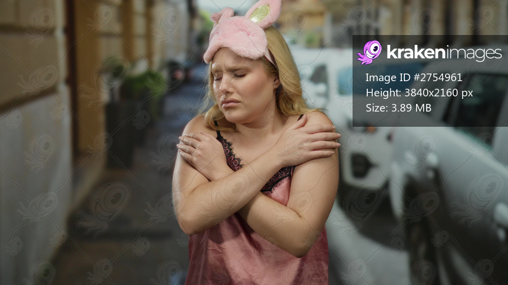 Young blonde woman wearing pink bunny sleep mask and nightgown shivers cold on an urban street with cars in the city.