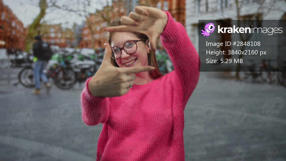 Young blonde woman wearing pink sweater frames face with fingers on urban street; playful creativity.