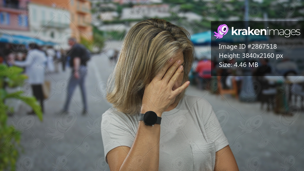 Young blonde woman wearing smartwatch and casual tee pinches nose with hand amid passersby on street; disgust.