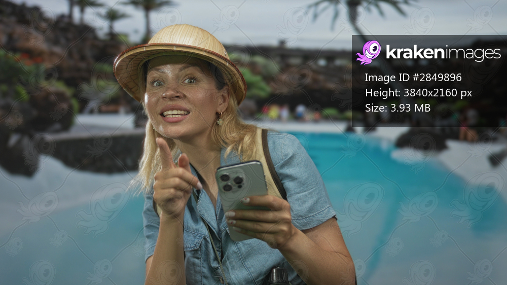 Young blonde woman wearing straw hat and holding smartphone while pointing finger at camera in resort pool; excitement joy adventure exploration.
