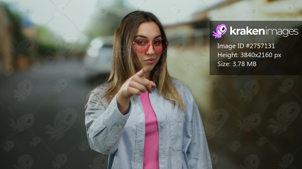 Young blonde woman wearing sunglasses inviting with finger gesture on outdoor street showcasing friendly and confident vibe in bright daylight