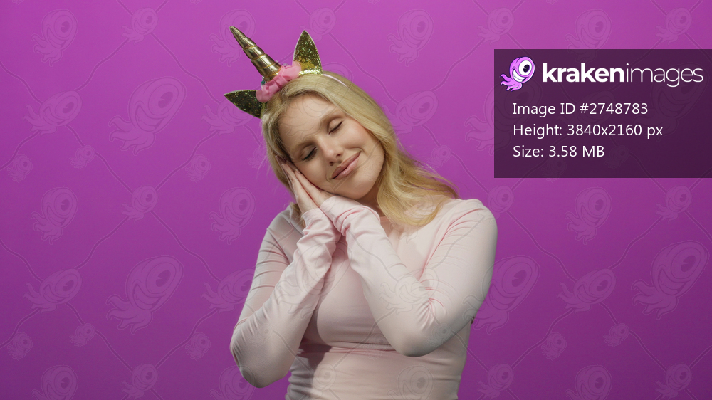 Young blonde woman wearing unicorn diadem making funny sleeping gesture against pink background