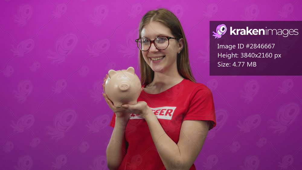 Young blonde woman wearing volunteer shirt smiling holds piggy bank in studio; generosity charity donation.