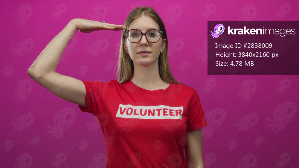 Young blonde woman wearing volunteer t shirt and round glasses salutes in pink studio; civic duty solidarity.
