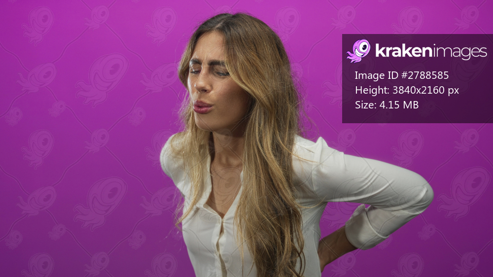 Young blonde woman wearing white blouse holds lower back in purple studio setting; pain discomfort backache fatigue.