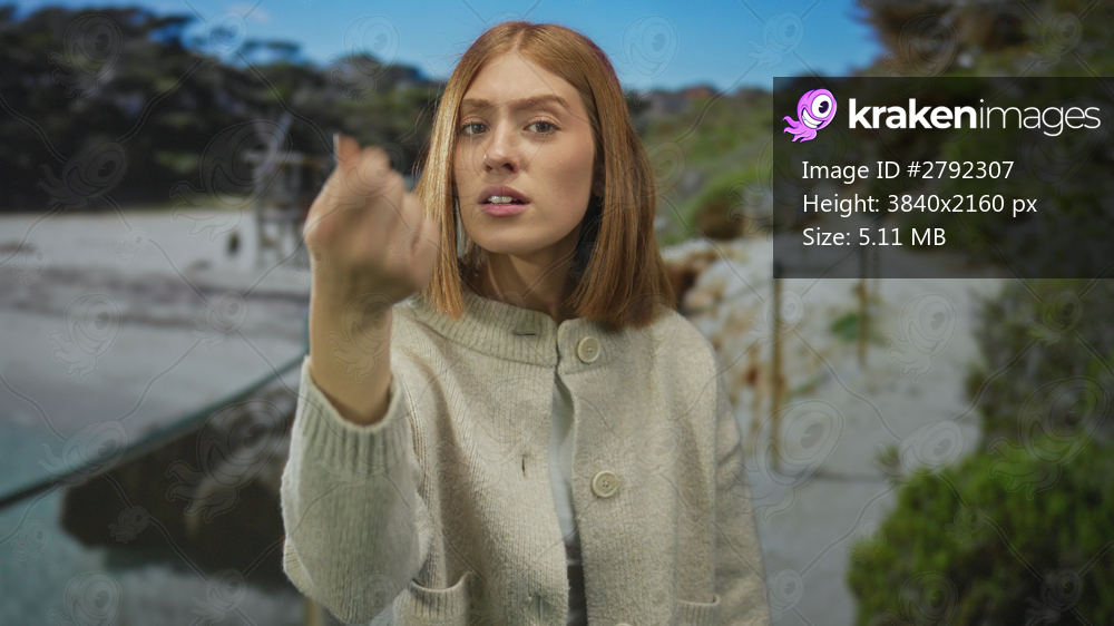 Young blonde woman wears knit cardigan and taps a raised fist against an imaginary door on a beach pier; curiosity whimsy.