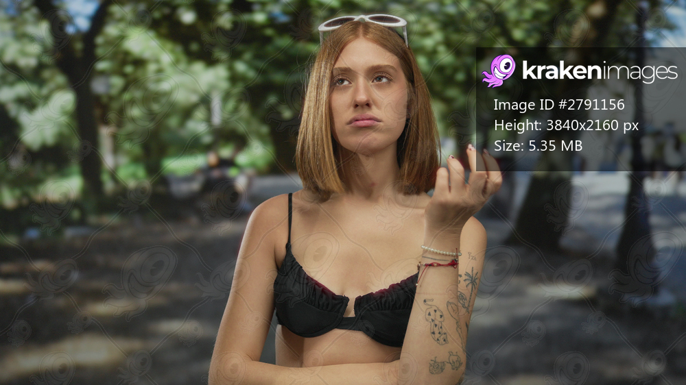 Young blonde woman yawns showing bare arms and shoulder tattoos while wearing a bikini top in a lush park under natural sunlight; boredom apathy fatigue. - Kraken Images