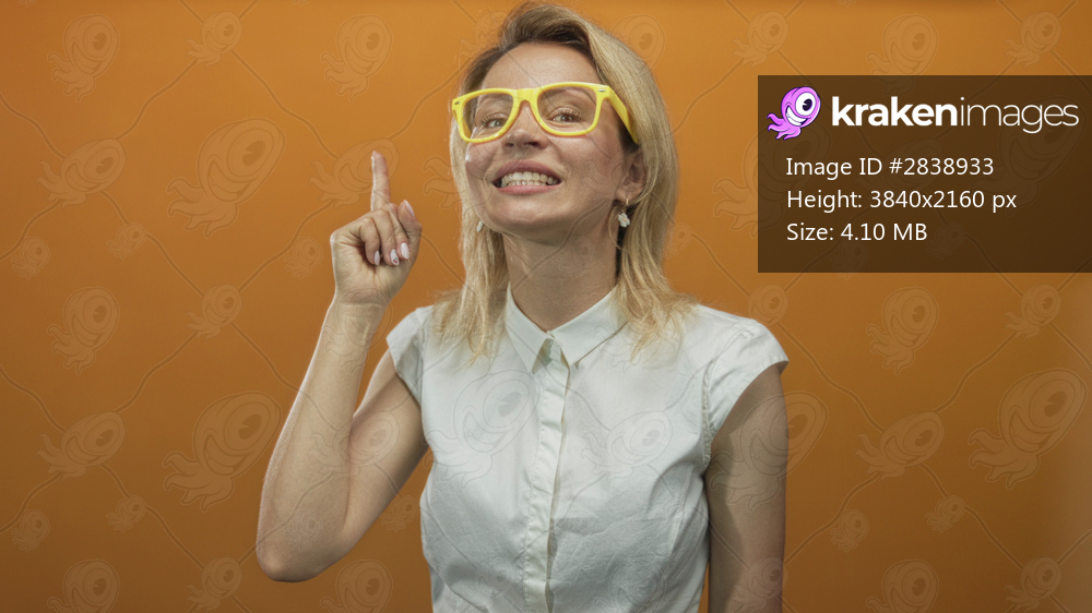Young blonde woman with yellow eyeglasses pointing finger upward with a smile in orange studio; inspiration.