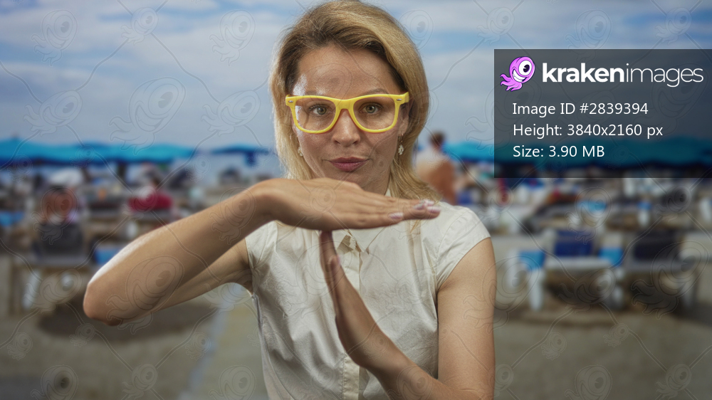 Young blonde woman with yellow glasses makes timeout sign on sandy beach amid blurred umbrellas; frustration.