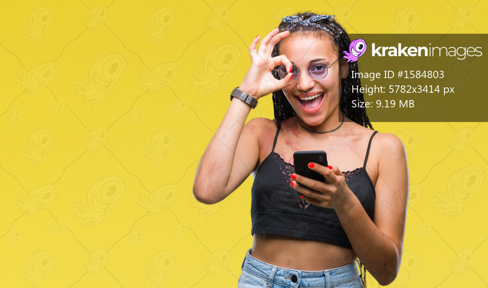 Young braided hair african american with birth mark using smartphone over isolated background with happy face smiling doing ok sign with hand on eye looking through fingers - Kraken Images