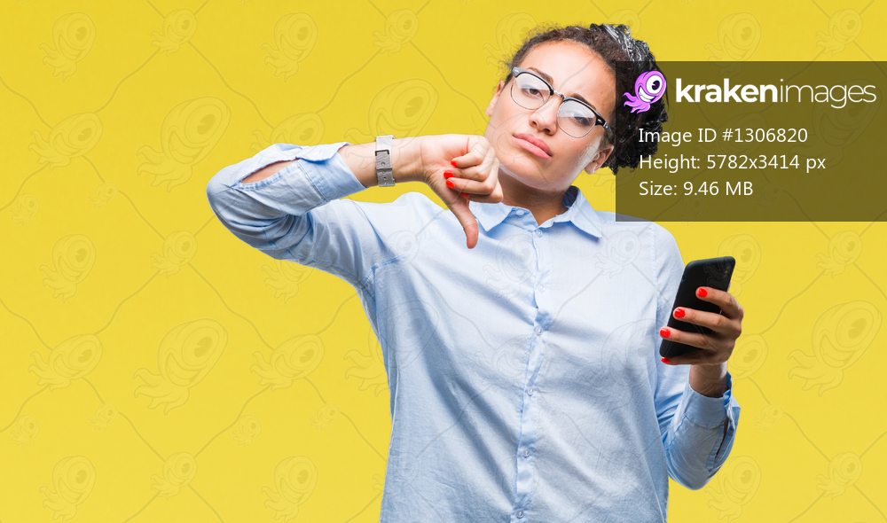 Young braided hair african american business girl using smartphone over isolated background with angry face, negative sign showing dislike with thumbs down, rejection concept - Kraken Images