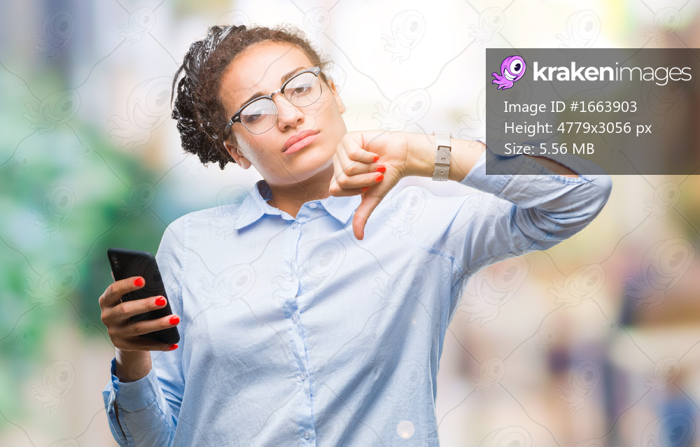 Young braided hair african american business girl using smartphone over isolated background with angry face, negative sign showing dislike with thumbs down, rejection concept - Kraken Images