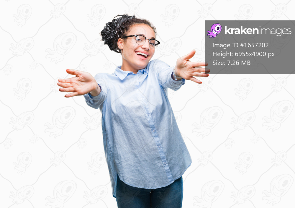 Young braided hair african american business girl wearing glasses over isolated background looking at the camera smiling with open arms for hug. Cheerful expression embracing happiness. - Kraken Images
