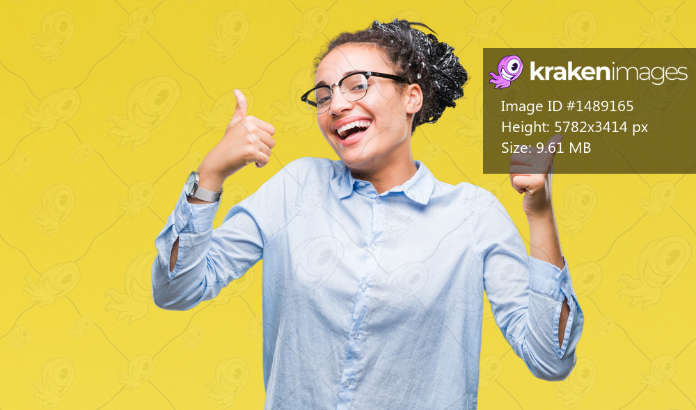 Young braided hair african american business girl wearing glasses over isolated background success sign doing positive gesture with hand, thumbs up smiling and happy. Looking at the camera with cheerful expression, winner gesture.