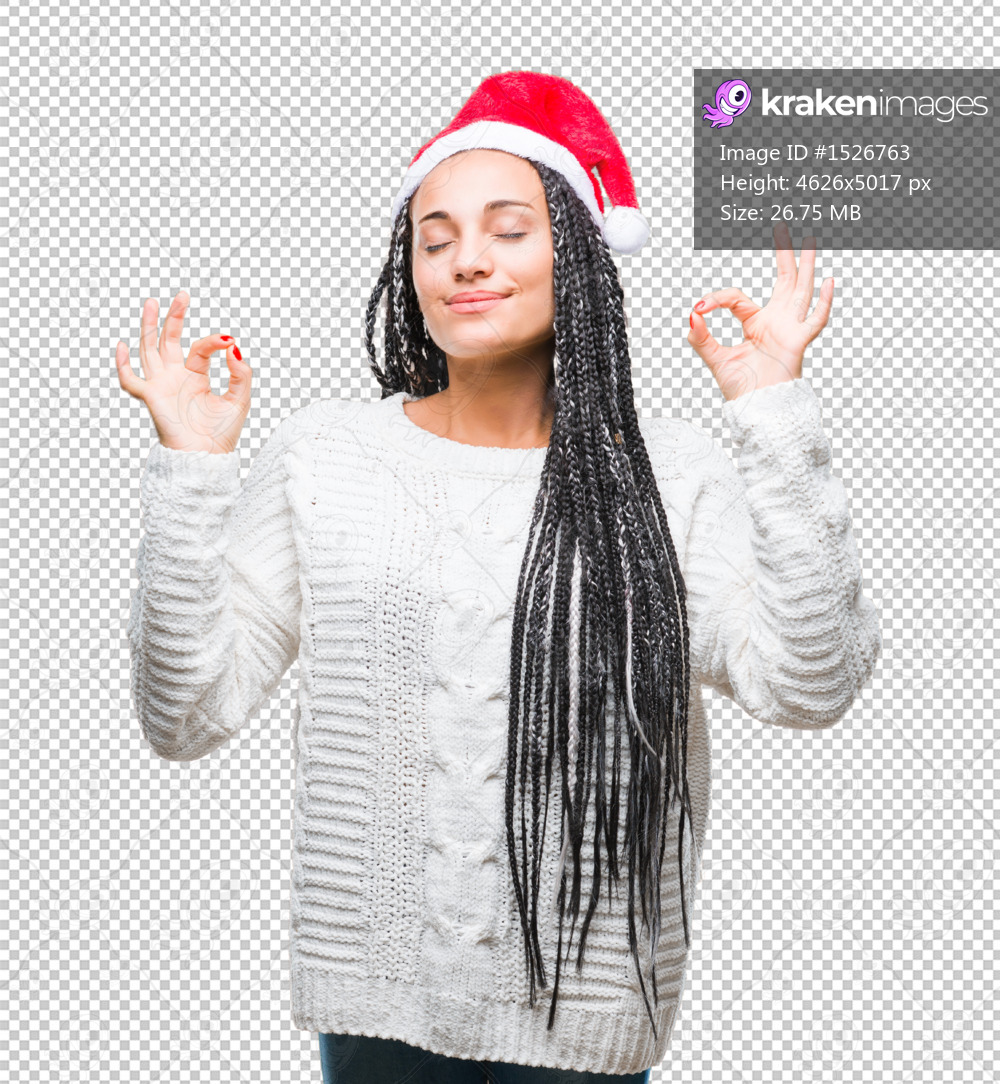 Young braided hair african american girl wearing christmas hat over isolated background relax and smiling with eyes closed doing meditation gesture with fingers. Yoga concept. - Kraken Images