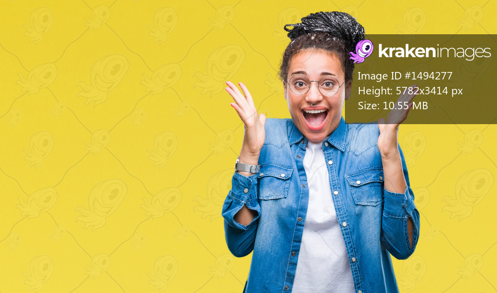 Young braided hair african american girl wearing glasses over isolated background celebrating crazy and amazed for success with arms raised and open eyes screaming excited. Winner concept - Kraken Images