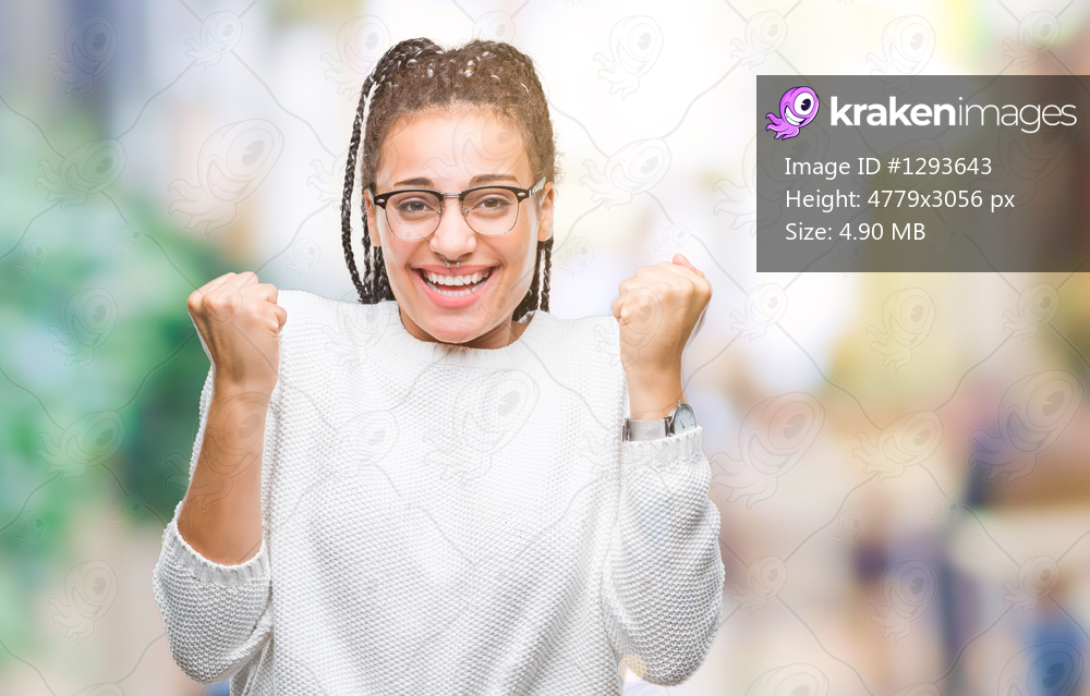 Young braided hair african american girl wearing glasses and sweater over isolated background celebrating surprised and amazed for success with arms raised and open eyes. Winner concept. - Kraken Images