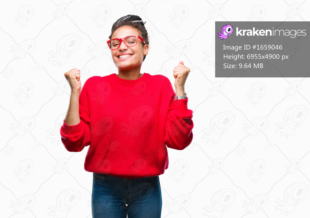 Young braided hair african american girl wearing sweater and glasses over isolated background celebrating surprised and amazed for success with arms raised and open eyes. Winner concept. - Kraken Images