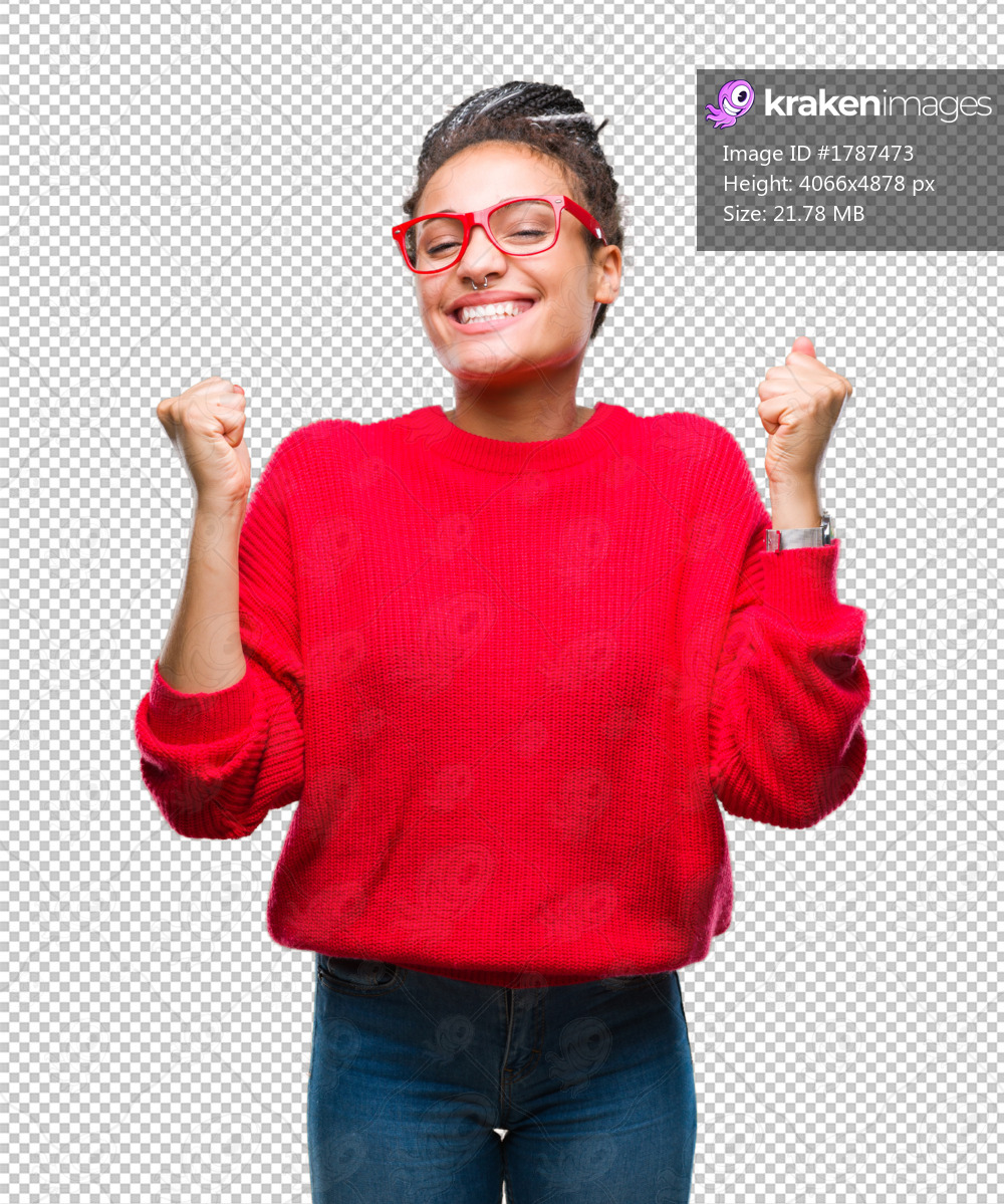 Young braided hair african american girl wearing sweater and glasses over isolated background celebrating surprised and amazed for success with arms raised and open eyes. Winner concept. - Kraken Images