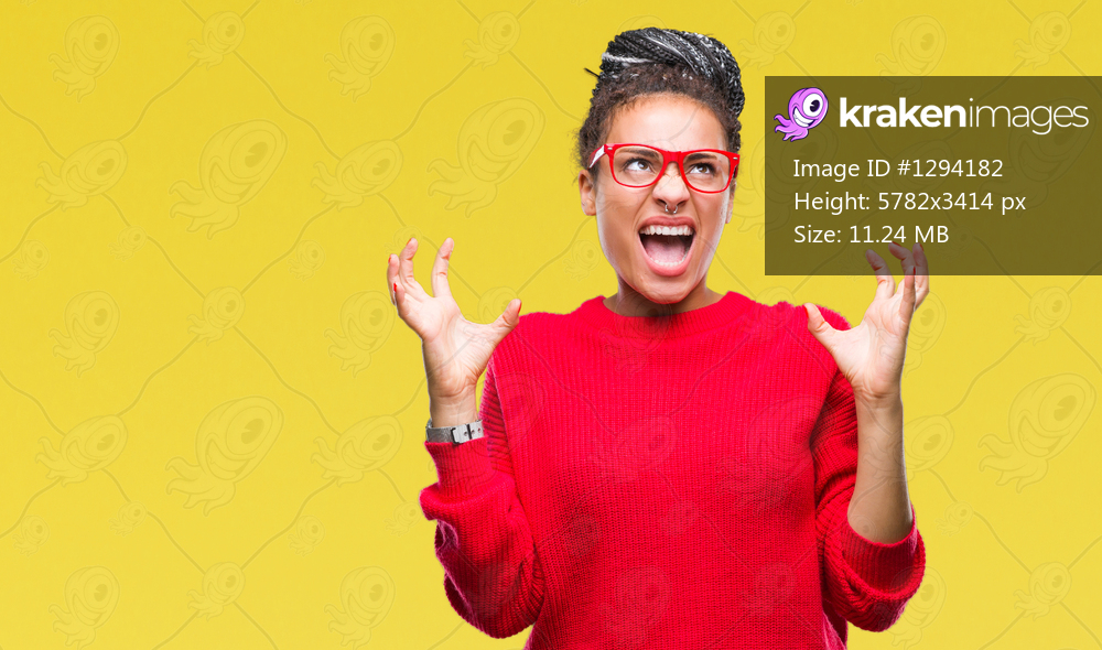 Young braided hair african american girl wearing sweater and glasses over isolated background crazy and mad shouting and yelling with aggressive expression and arms raised. Frustration concept. - Kraken Images