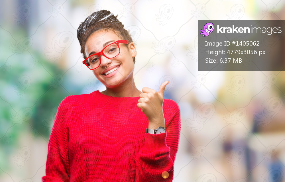Young braided hair african american girl wearing sweater and glasses over isolated background doing happy thumbs up gesture with hand. Approving expression looking at the camera with showing success. - Kraken Images