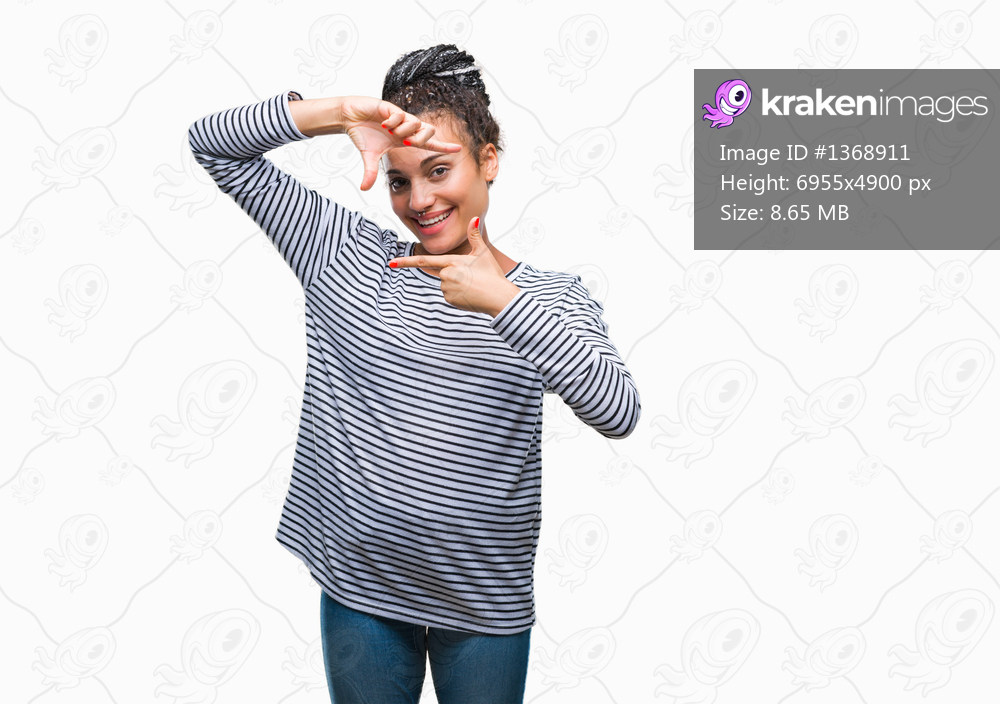 Young braided hair african american girl wearing sweater over isolated background smiling making frame with hands and fingers with happy face. Creativity and photography concept. - Kraken Images