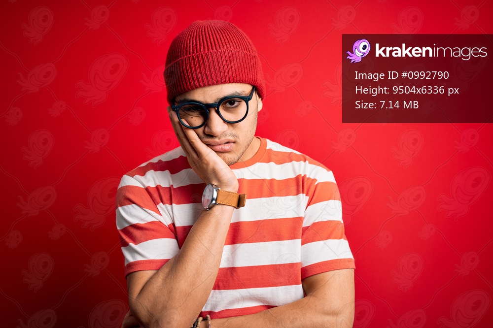Young brazilian man wearing casual striped t-shirt and glasses over isolated red background thinking looking tired and bored with depression problems with crossed arms. - Kraken Images