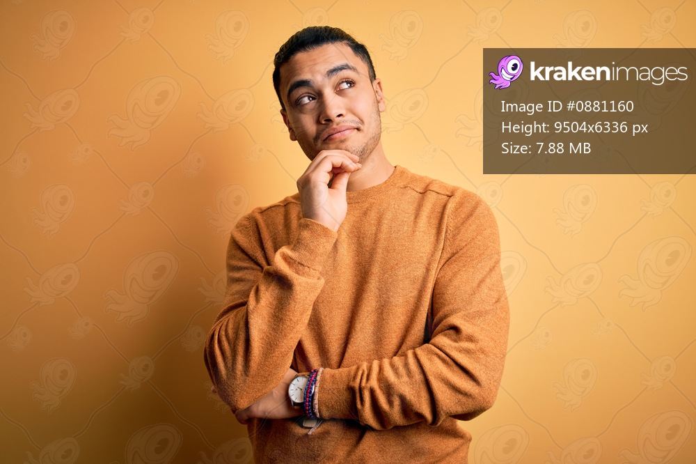 Young brazilian man wearing casual sweater standing over isolated yellow background with hand on chin thinking about question, pensive expression. Smiling and thoughtful face. Doubt concept. - Kraken Images