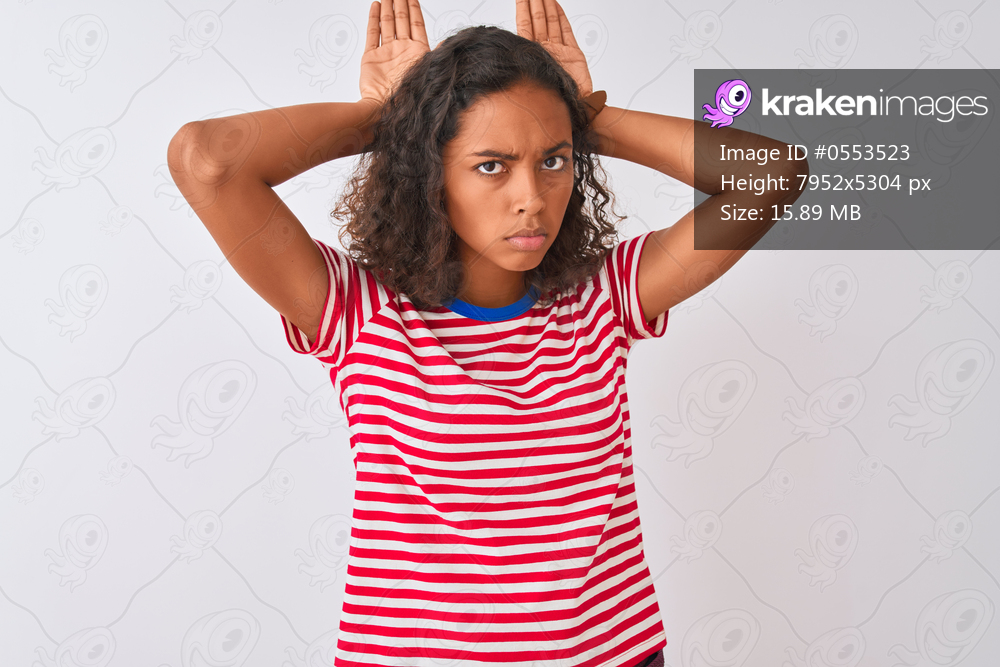 Young brazilian woman wearing red striped t-shirt standing over isolated white background Doing bunny ears gesture with hands palms looking cynical and skeptical. Easter rabbit concept. - Kraken Images