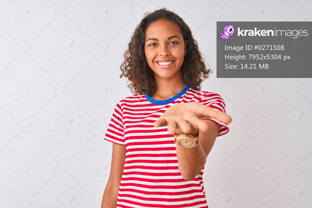 Young brazilian woman wearing red striped t-shirt standing over isolated white background smiling cheerful offering palm hand giving assistance and acceptance. - Kraken Images