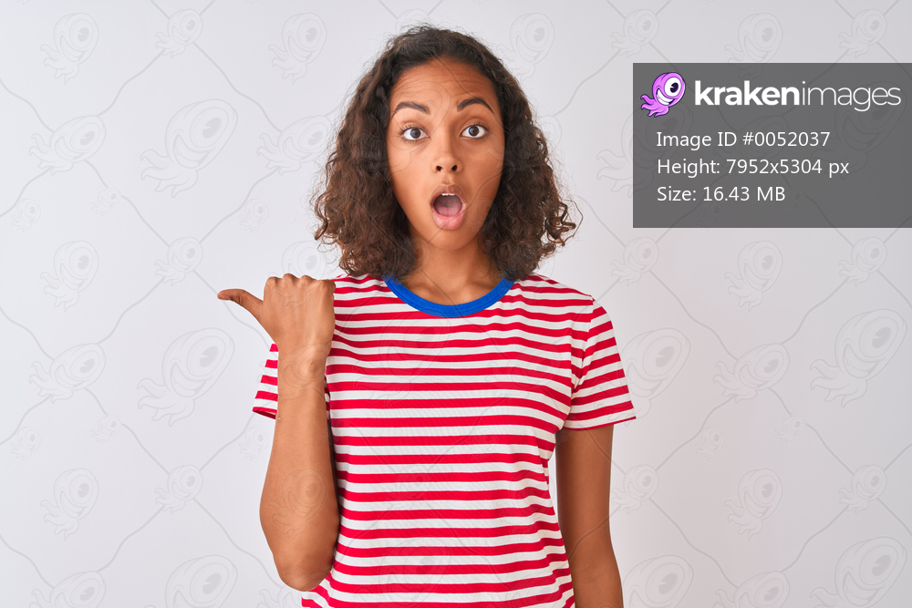 Young brazilian woman wearing red striped t-shirt standing over isolated white background Surprised pointing with hand finger to the side, open mouth amazed expression. - Kraken Images