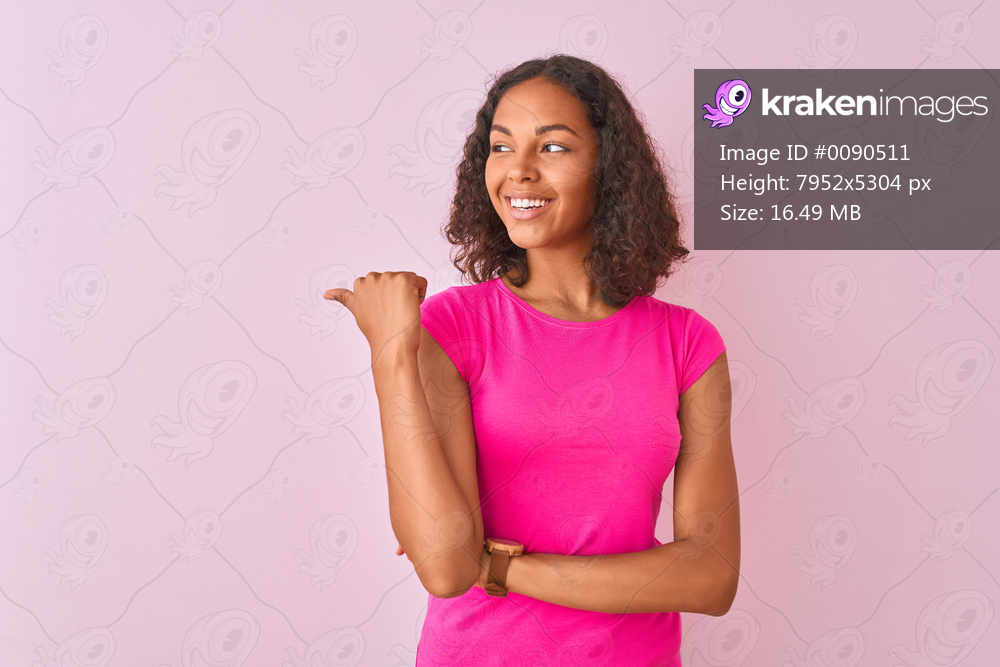 Young brazilian woman wearing t-shirt standing over isolated pink background smiling with happy face looking and pointing to the side with thumb up.