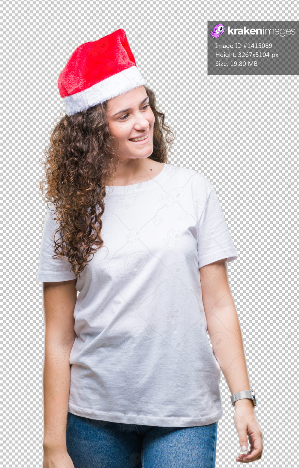 Young brunette girl wearing christmas hat over isolated background looking away to side with smile on face, natural expression. Laughing confident.