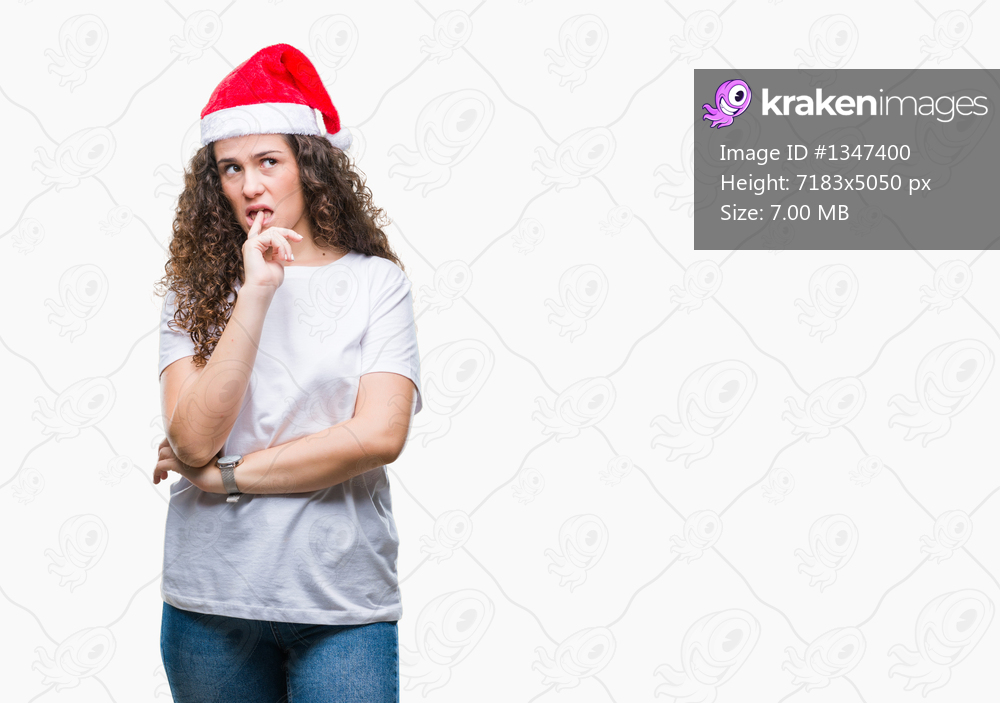 Young brunette girl wearing christmas hat over isolated background looking stressed and nervous with hands on mouth biting nails. Anxiety problem.