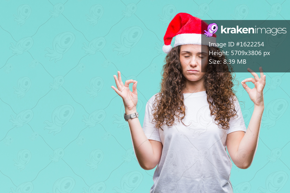 Young brunette girl wearing christmas hat over isolated background relax and smiling with eyes closed doing meditation gesture with fingers. Yoga concept. - Kraken Images