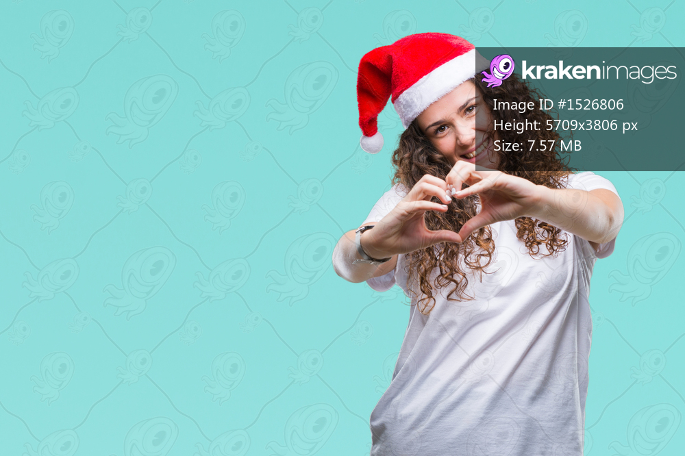 Young brunette girl wearing christmas hat over isolated background smiling in love showing heart symbol and shape with hands. Romantic concept.