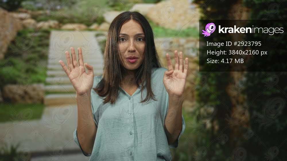 Young brunette hispanic woman hands raised palms forward wearing light green blouse on outdoor stone steps near building; surprise caution.