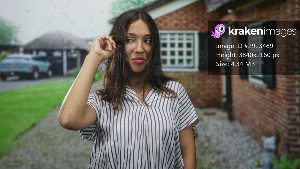 Young brunette hispanic woman touches hair with hand at brick building entrance smiling gently to camera; warm contentment.