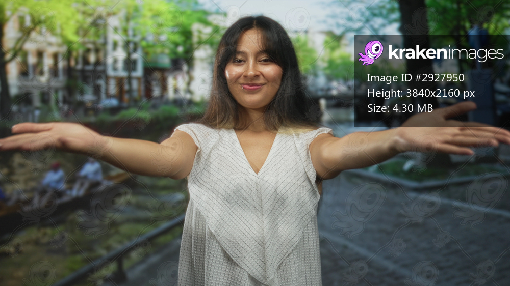 Young brunette latina hispanic woman with outstretched arms smiling on a cobbled street by a canal in amsterdam; joy openness connection.