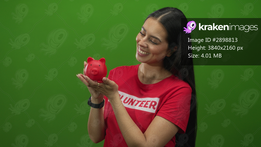 Young brunette volunteer woman holding red piggy bank and smiling in green studio; saving charity generosity.