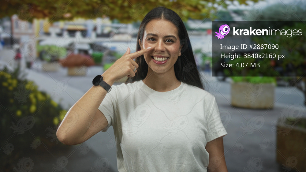 Young brunette woman finger to nose on street, smiling with smartwatch and casual white tee; playful joy.