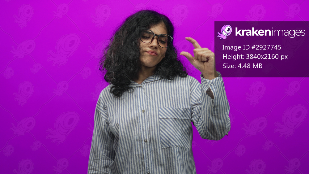 Young brunette woman with glasses pinching fingers to show small size in purple studio wearing striped shirt and neutral expression; skepticism.