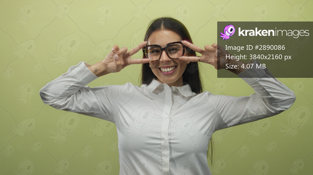 Young brunette woman with glasses smiling and making a double peace sign in green studio; playful joy.