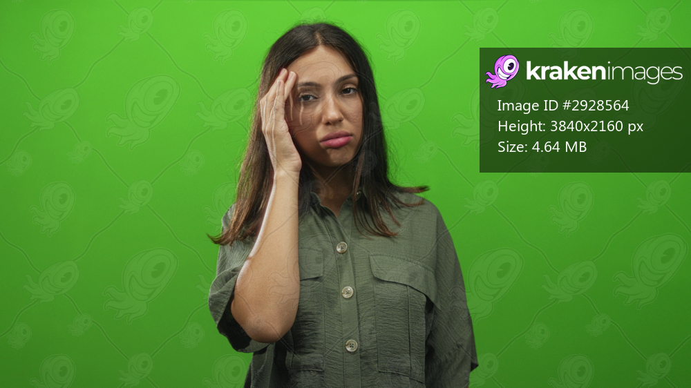 Young brunette woman with hand on temple and slight grimace in studio against bright green backdrop; fatigue.