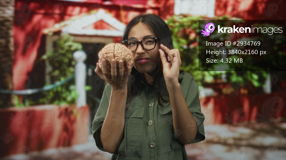 Young brunette woman holding a model brain with hands at house entrance outdoors while making pinching gesture with other hand; curiosity science learning. - Kraken Images