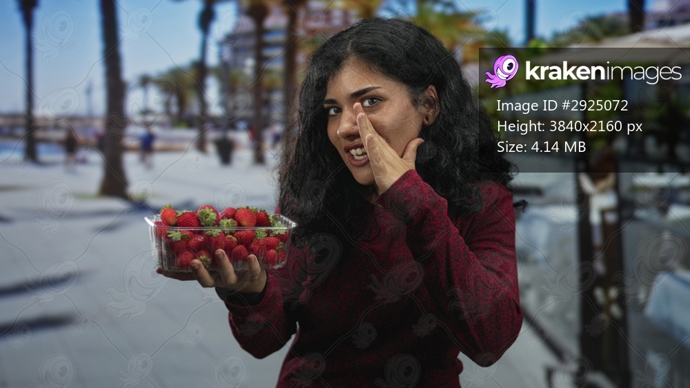 Young brunette woman holding a plastic container of strawberries with hand on cheek for toothache on street near restaurant terrace outdoors; playful curiosity. - Kraken Images